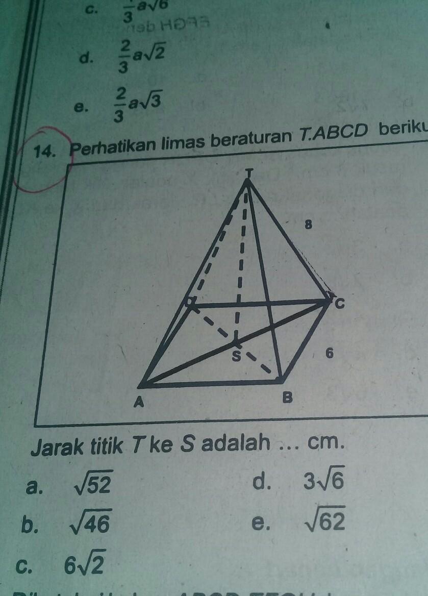Diketahul limas segl empat beraturan t.abcd (alas berbentuk persegi) dengan panjang a b = 10 c m. Butuh jawab soal matematika, fisika, atau kimia lainnya? Jarak titik c ke garis at =. Diketahui limas segiempat beraturan t.abcd seperti pada gambar. Pada limas beraturan d.abc yang panjang rusuknya 12 cm, jarak titik d ke bidang abc sama dengan …